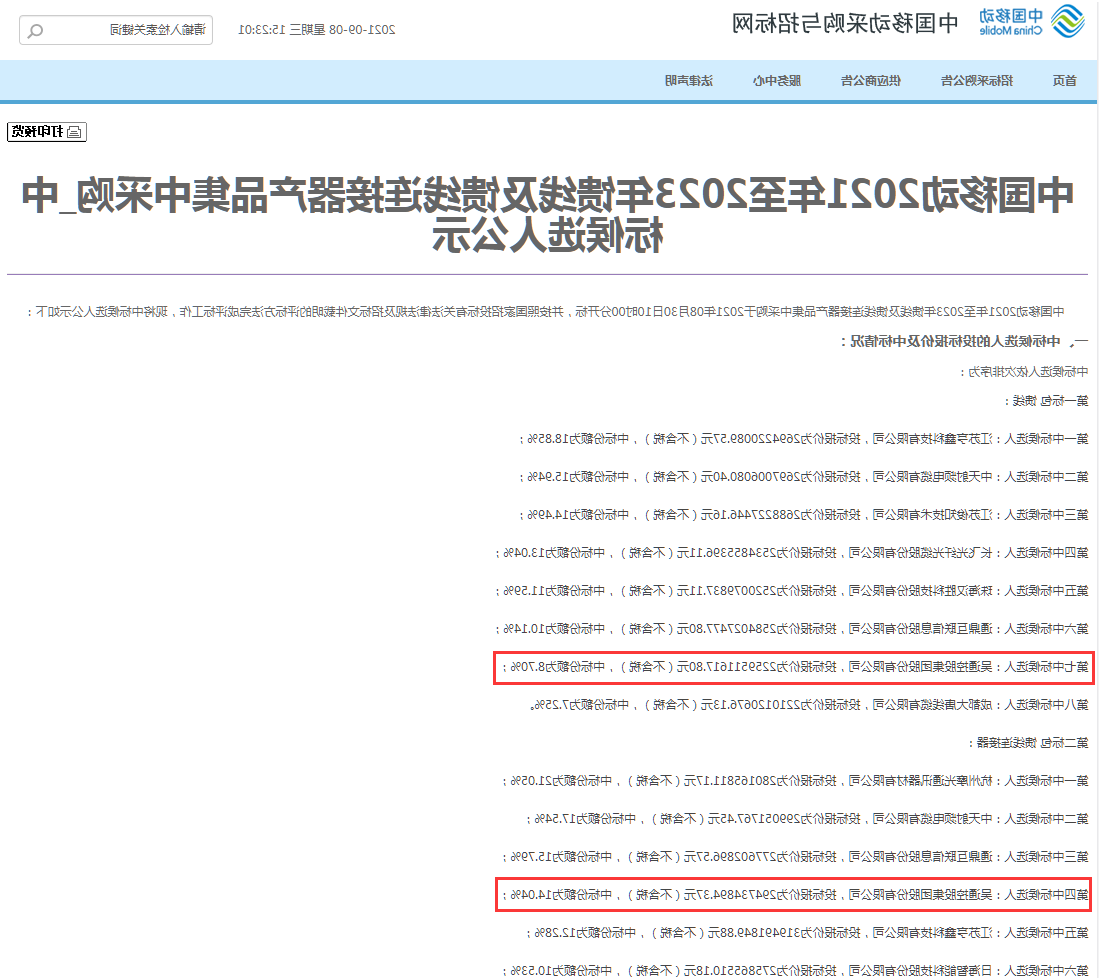 吴通集团中标中国移动馈线及馈线连接器产品集采项目双标包